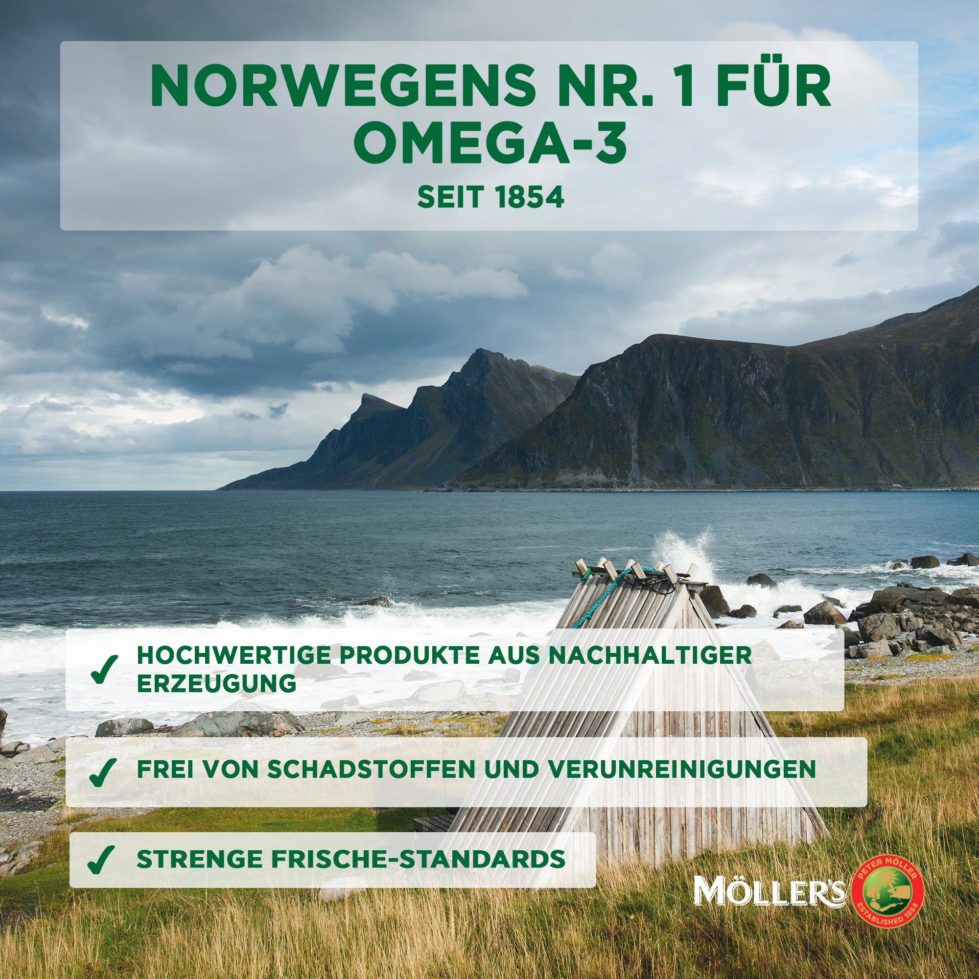 Möller’s Omega-3 Kapseln Hochdosiert enthalten reines Fischöl mit den wertvollen Omega-3-Fettsäuren EPA und DHA in natürlicher Triglycerid-Form. Das hochwertige Konzentrat wird vom Körper besonders gut aufgenommen, daher sind die Kapseln gut verträglich und verursachen keinen störenden Nachgeschmack.